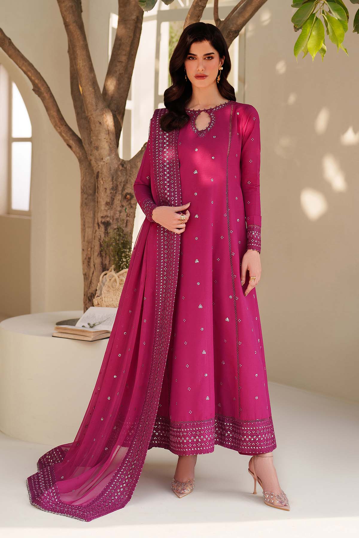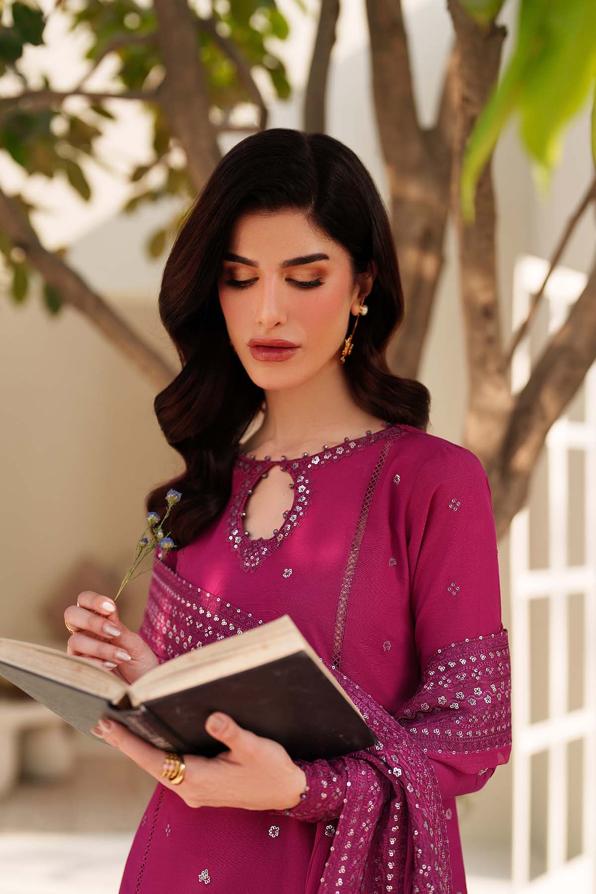 Summary: Embrace festive elegance with the 'Horain' ensemble from the Zarif Tabeer Silk Edit. This stunning unstitched Pakistani suit features a magnificent kameez in a vibrant magenta hue, crafted from luxurious raw silk. The entire shirt—front, back, and sleeves—is adorned with intricate sequin embroidery, creating a subtle shimmer. A beautifully detailed embroidered neckline adds a touch of classic sophistication. The lightweight silk fabric makes it a perfect choice for Spring/Summer occasions. This ethnic wear masterpiece is designed for grand celebrations, making it an ideal outfit for wedding guests or festive Eid gatherings. A truly elegant choice for your wardrobe.