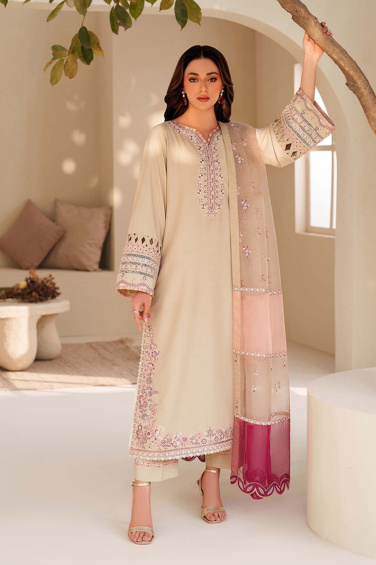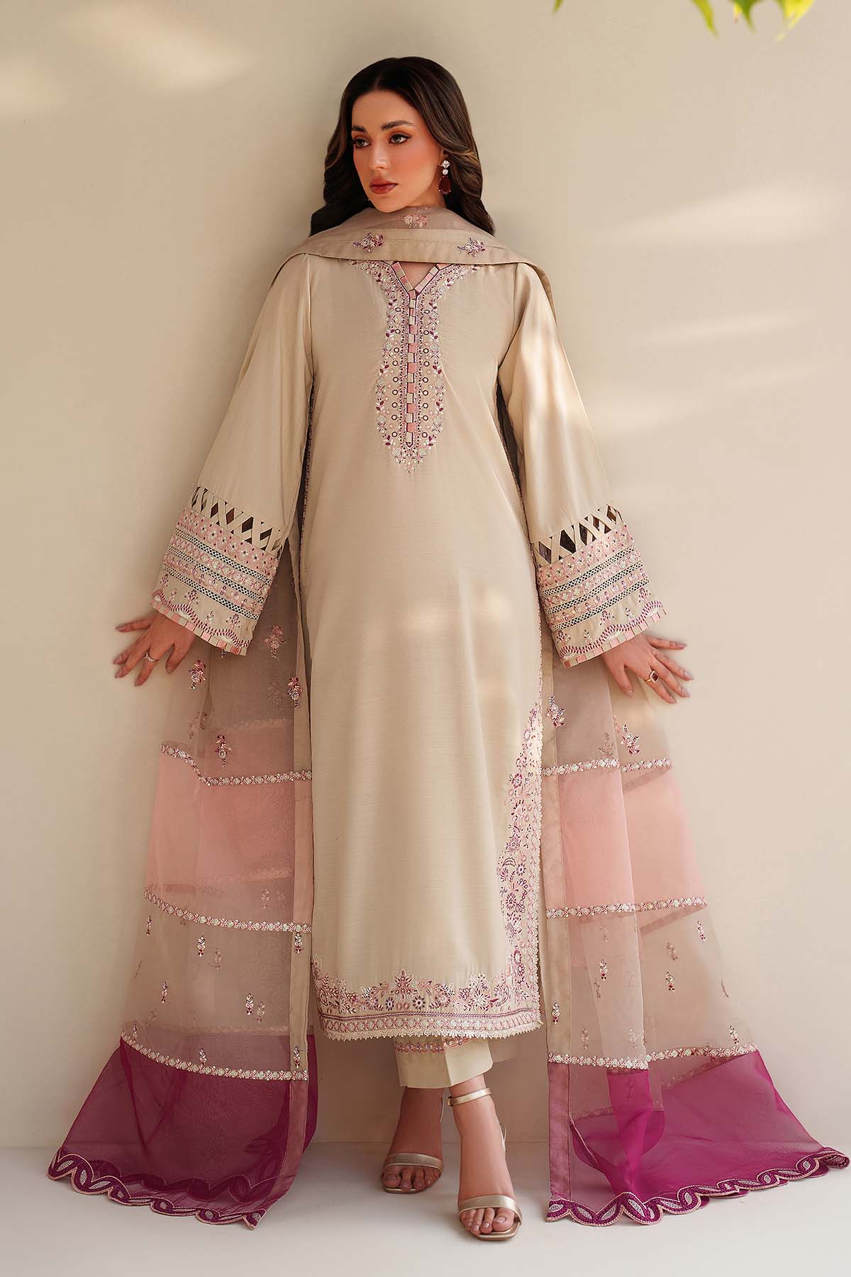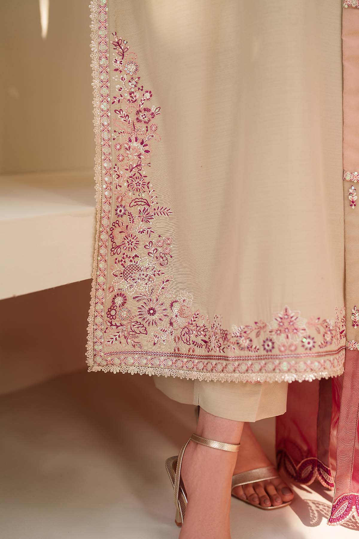 Summary: Discover timeless elegance with the 'Raag' ensemble from Zarif's Tabeer Silk Edit. This exquisite Pakistani suit features a sophisticated beige kameez crafted from pure raw silk, making it a luxurious choice for spring and summer festivities. The shirt is adorned with delicate sequins embroidery on the front, neckline, and sleeves, which feature stunning cutwork details. As a premium piece of ethnic wear, this silk outfit exudes grace and poise. Its understated yet elegant design makes this formal wear perfect for Eid celebrations, wedding guest attire, or any upscale event where you want to make a refined statement.