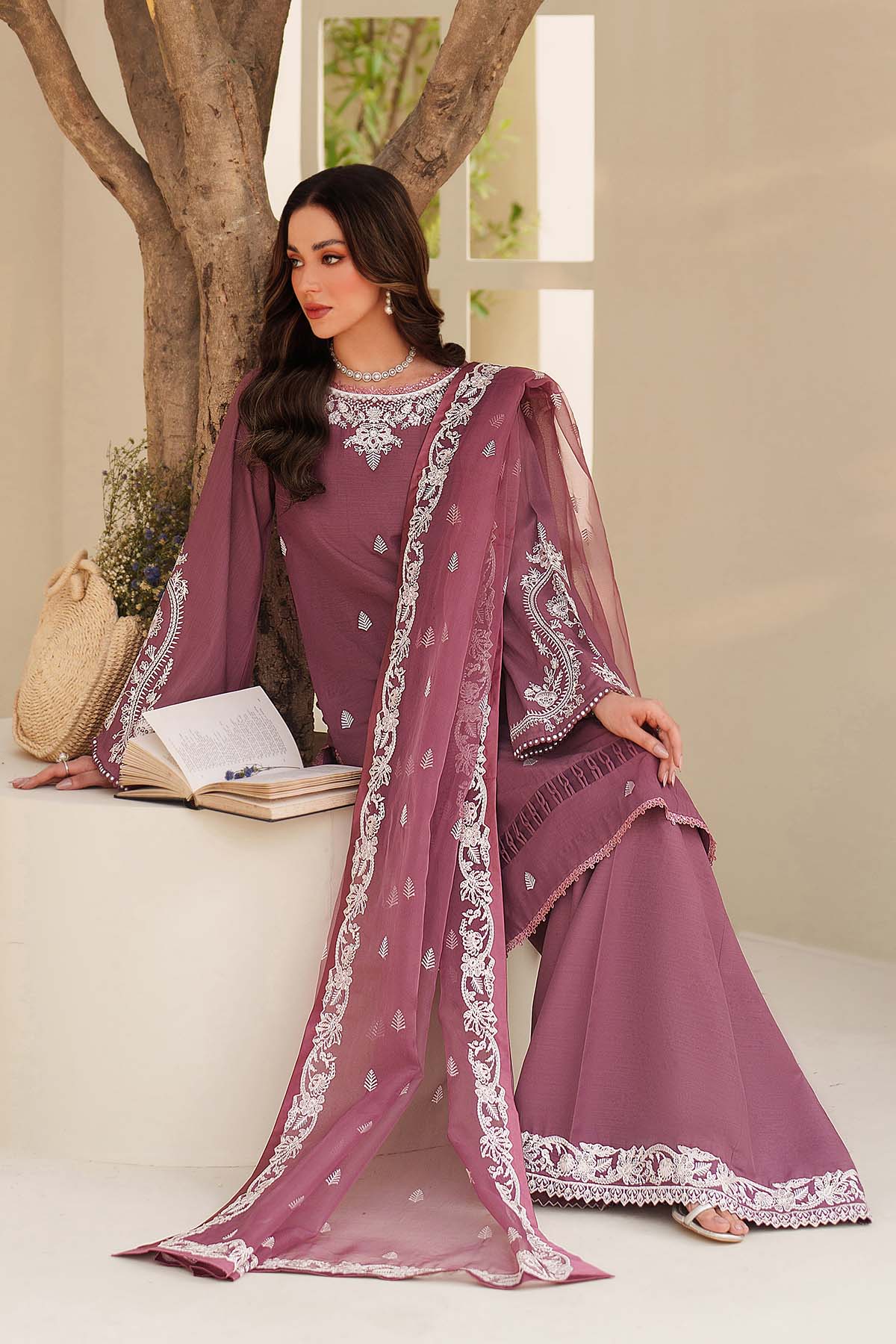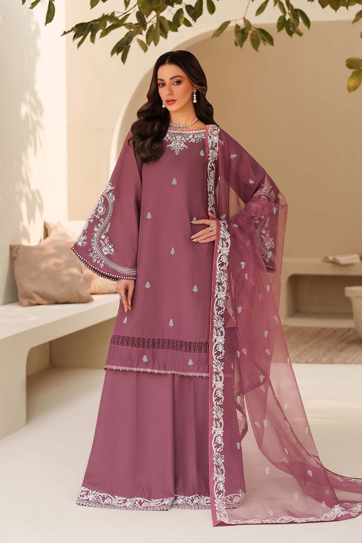 Summary: Embrace timeless elegance with the 'Sung' ensemble from Zarif's Tabeer Silk Edit. This Pakistani suit features a gorgeous purple shirt crafted from luxurious raw silk, making it a perfect choice for Spring/Summer festivities. The kameez is adorned with intricate sequin embroidery on the front and statement flared sleeves, creating a look of sophisticated charm. This elegant ethnic wear is a stunning choice for parties, weddings, and formal events. Shop this beautiful Pakistani dress online, ideal for making a graceful statement at any celebration.