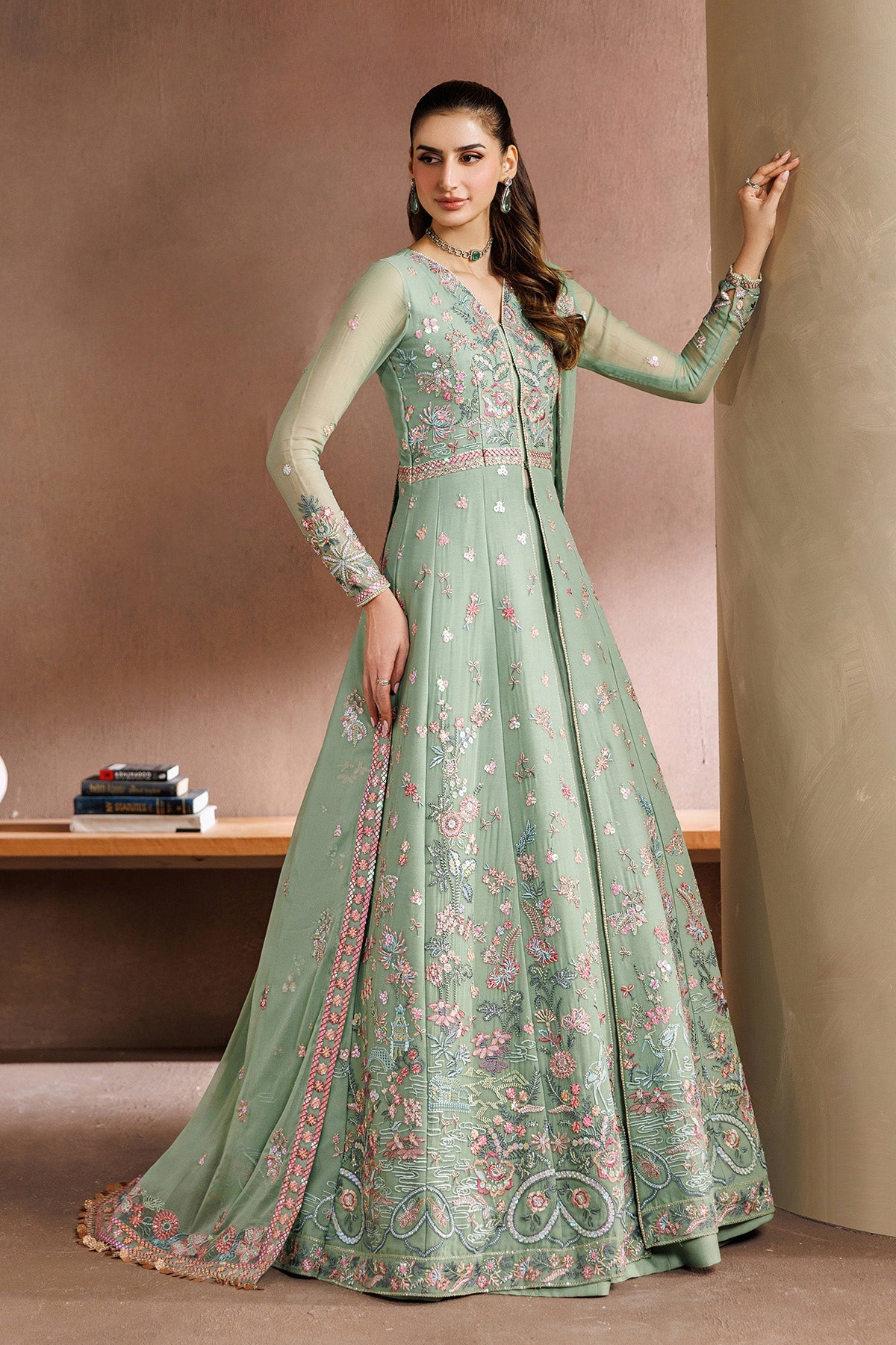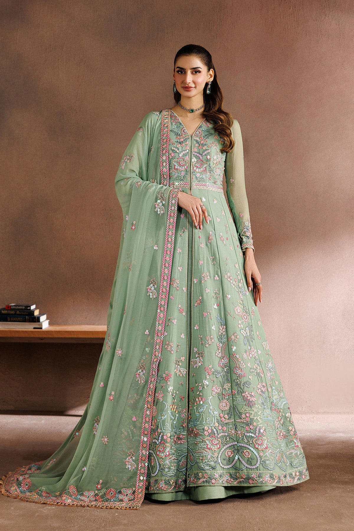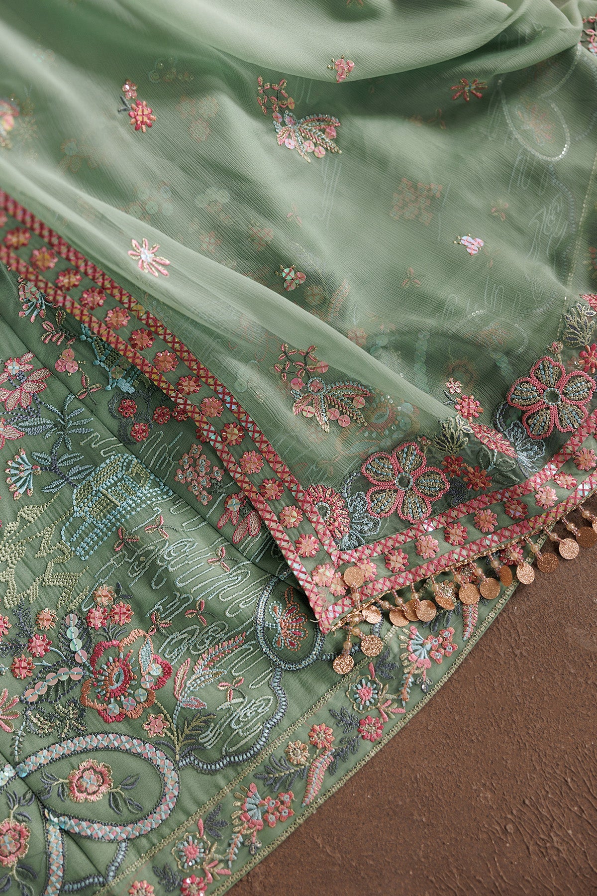 Summary: Step into elegance with this breathtaking sea green Pakistani dress from Zarif Zayrah Formals. Masterfully crafted from airy chiffon, this unstitched Pakistani suit boasts exquisite sequins embroidery across the shirt and delicate sheer sleeves. Its flowing silhouette and intricate floral motifs make it an exceptional choice for elegant formal wear. Being a breathable chiffon outfit, it perfectly transitions into spring and summer festive fashion. The soft green hues make this ethnic ensemble an ideal Pakistani Mehndi dress or a sophisticated wedding guest look. Enhance your festive wardrobe and shop online today for an unforgettable Eid or wedding outfit.