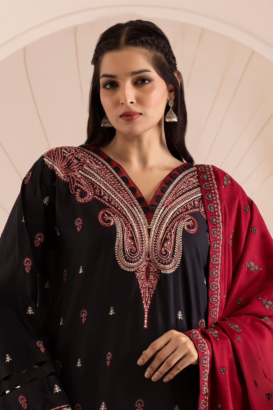 Summary: Embrace timeless elegance with this stunning black Pakistani suit by Zellbury. This unstitched formal wear is crafted from premium Cotton Satin, a fabric known for its subtle luster and comfortable drape, making it perfect for the Fall/Winter season. The kameez features elaborate and contrasting red and off-white embroidery that beautifully frames the V-neckline and adorns the cuffs. This sophisticated ethnic wear ensemble, with its classic color palette, is a quintessential choice for formal dinners, evening parties, and winter weddings. A perfect addition to your festive wardrobe.