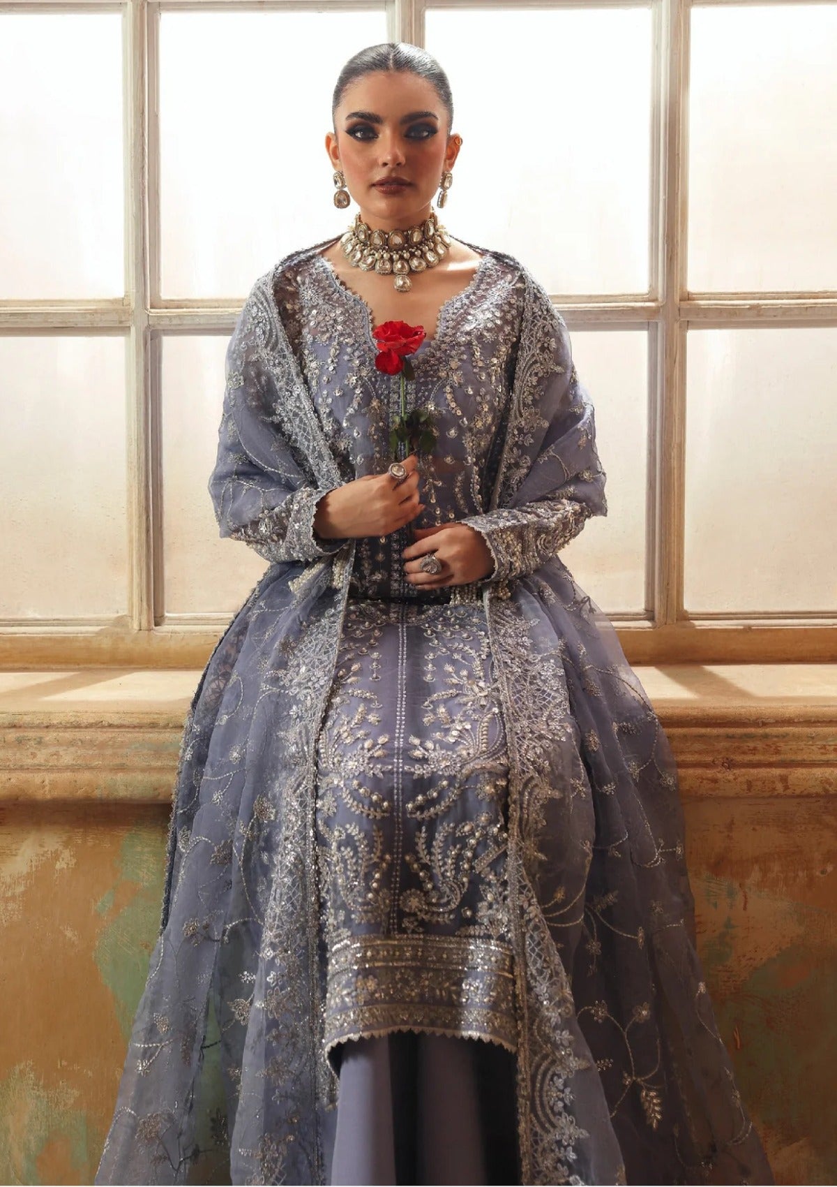 Summary: Elevate your festive wardrobe with this stunning Lavender Pakistani Suit from the Zyra Luxury Wedding Formals collection. The centerpiece is the exquisite Organza shirt, heavily adorned with shimmering Resham and Sequin embroidery that covers the front, back, and sleeves in intricate floral motifs. The sheer, breathable Organza fabric makes this ensemble a sophisticated choice for Spring/Summer wedding functions and formal evening events. Designed for the modern woman who cherishes tradition, this unstitched dress material creates a refined silhouette perfect for a Walima or engagement party. Embrace casual elegance and luxury with this timeless ethnic outfit. Shop this festive masterpiece online.